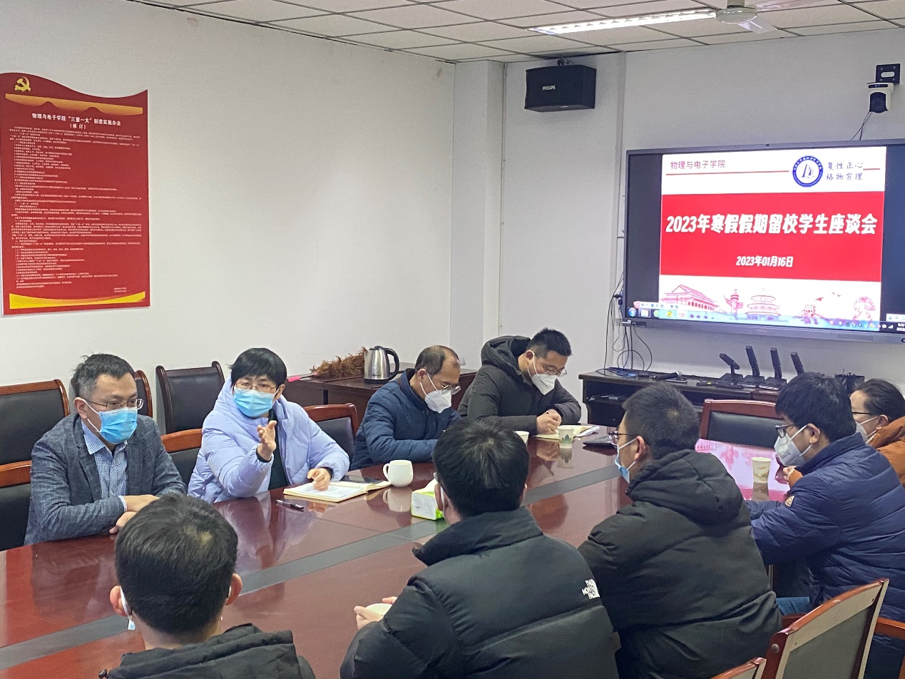 1月16日上午,h漫画 在A311会议室召开寒假留校学生座谈会。学院院长、党委副书记白莹,党委副书记刘寒冰,副院长李国强以及辅导员吴坤代表学院与学生进行了亲切交流。