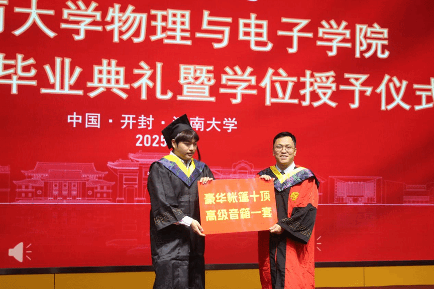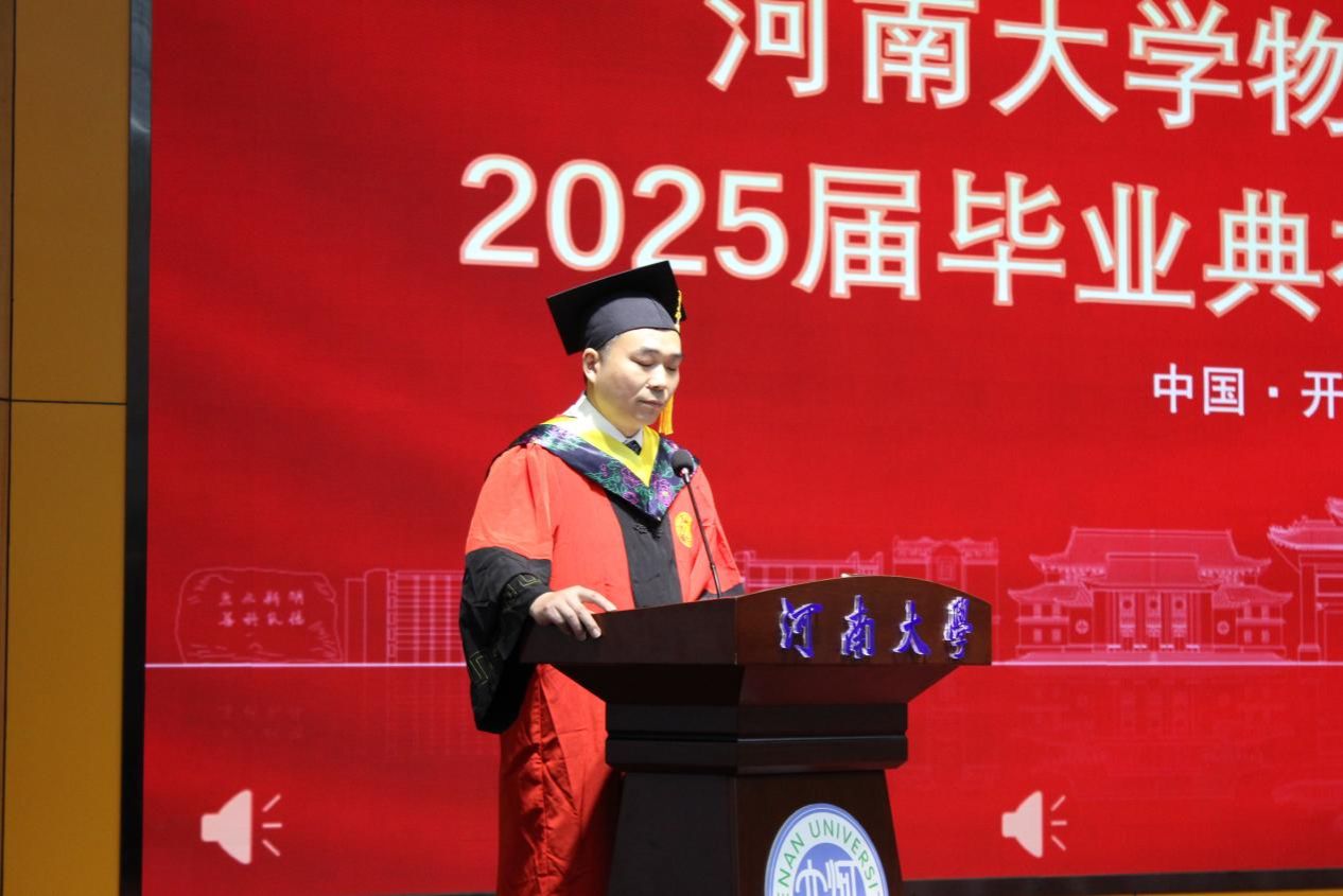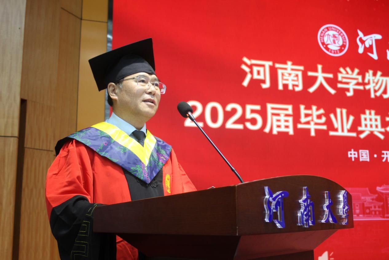 张慧充分肯定了毕业生取得的优异成绩,回顾了同学们与时代同频、与学校共荣的成长历程,以及学院在学科建设、人才培养领域的突破性成就。他指出作为2025届毕业生既是亲历者,更是参与者和贡献者。如今同学们即将奔向星辰大海,开启新的人生篇章。张慧以四句临别赠言与毕业生们共勉:一是持“格物穷理”之心,永葆对未知的好奇与探索的勇气,永怀赤子之心,做真理世界中永不疲倦的探索者;二是秉“明理致用”之志,将智慧转化为推动进步的磅礴力量,服务于国家所需、人民所盼,在建设科技强国和教育强国的伟大征程中刻下河大物电人的印记;三是守“求真务实”之道,用行动践行教育家、科学家精神,奋楫笃行、臻于至善,以科技之光照亮科教发展之路、以实干之光照亮人才成长之路;四是铸“家国情怀”之魂,在强国建设中书写不负时代的青春华章,将个人的职业规划与国家的发展战略紧密相连,心系“国家事”、肩扛“国家责”。最后他希望同学们无论飞多高、多远,学院永远是精神家园,期待大家常回母校,共叙情谊。