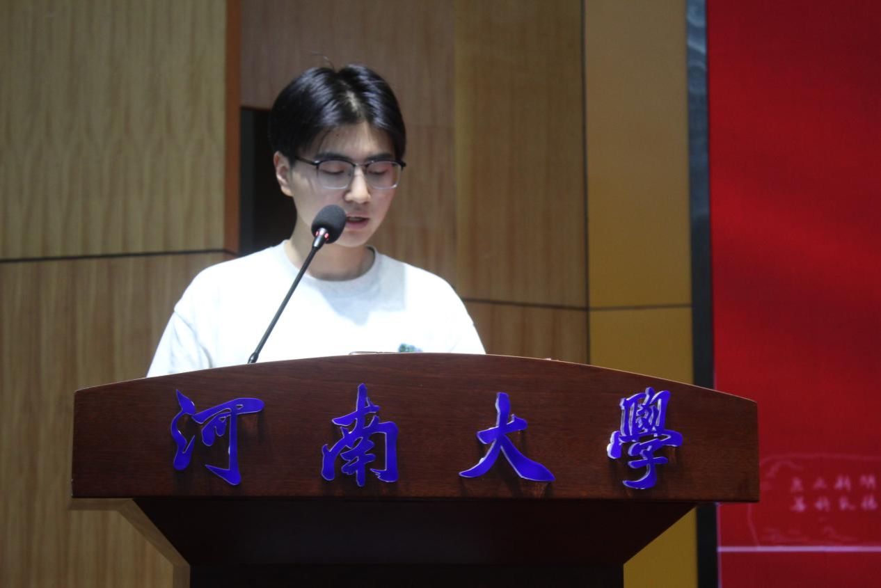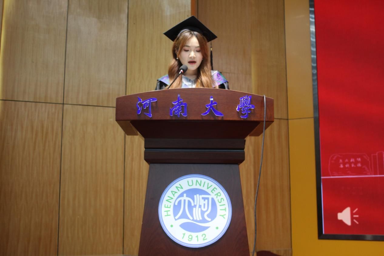2021级本科毕业生代表陶靖文感谢学院四年辛勤培养与老师无私付出,表示将牢记“复性正心,格物穷理”院训,以实际行动践行青春誓言。