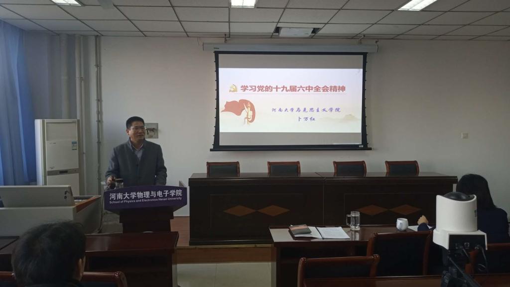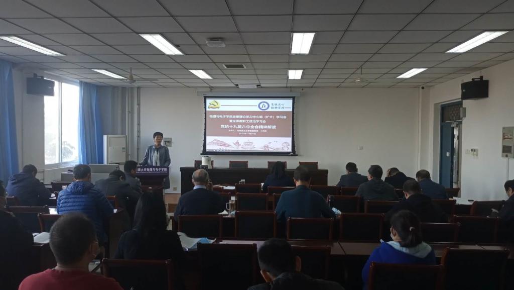 党委在学院A313会议室举行十九届六中全会精神学习会暨学院党委理论学习中心组(扩大)学习会。邀请马克思主义学院副教授卜万红作《学习党的十九届六中全会精神》专题报告。学院党委委员、班子成员、各党支部书记、系室(中心)主任、教师代表、学生代表在现场参加会议,其余教职工生通过网络以线上方式参会。报告会由学院党委书记王宏华主持。