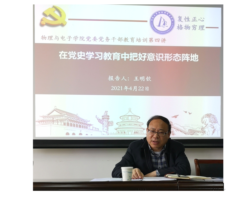 王明钦以《在党史学习教育中把好意识形态阵地》为题,联系当前正在进行的党史学习教育,结合习近平总书记视察清华大学时的讲话精神,介绍了省委书记王国生来我校与师生座谈交流情况,强调在党史学习教育中要悟思想、办实事、开新局;在党史学习教育中把好意识形态阵地,党务干部要不断提高政治判断力、政治领悟力、政治执行力,敢于担当,善于作为。