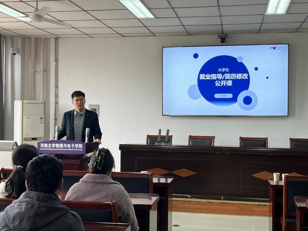 河南华普亿方集团生涯项目负责人刘峥从就业方向分析、求职简历制作和求职面试技巧三个方面做了讲解,并从模板选择、模块排序、体现能力和个人优势四个方面介绍了简历撰写的基本原则。他指出简历应体现学生对该岗位的匹配度。在面试指导环节,刘峥介绍了面试过程中面试官考察的重点内容、面试注意事项和面试常见问题,让同学们认清了面试的套路和雷区,他建议同学们多加练习,丰富自身就业技能。