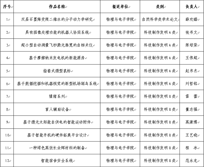 4月10日,共青团h漫画 委员会公布了此次竞赛的竞赛的结果,并于4月13日最终确定了入围省赛的参赛队伍,h漫画 有12件作品最终入选,其中,自然科学类学术论文类1件,科技制作发明A类5件,科技制作发明B类6件。