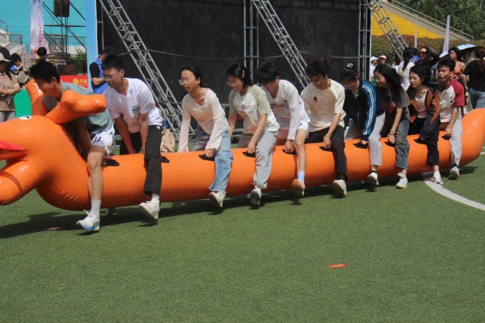 趣味项目比赛同样亮点频现。旱地龙舟赛场上,学院参赛队员以整齐的“一二、一二”口号为节奏,齐心协力推动“龙舟”快速前进,展现出高度默契与协作精神;集体跳绳项目中,同学们依次跃过长绳,轻盈身姿与欢快笑声交织,他们用汗水诠释着团结精神,以拼搏的奋斗姿态为学院赢得赛场荣誉!