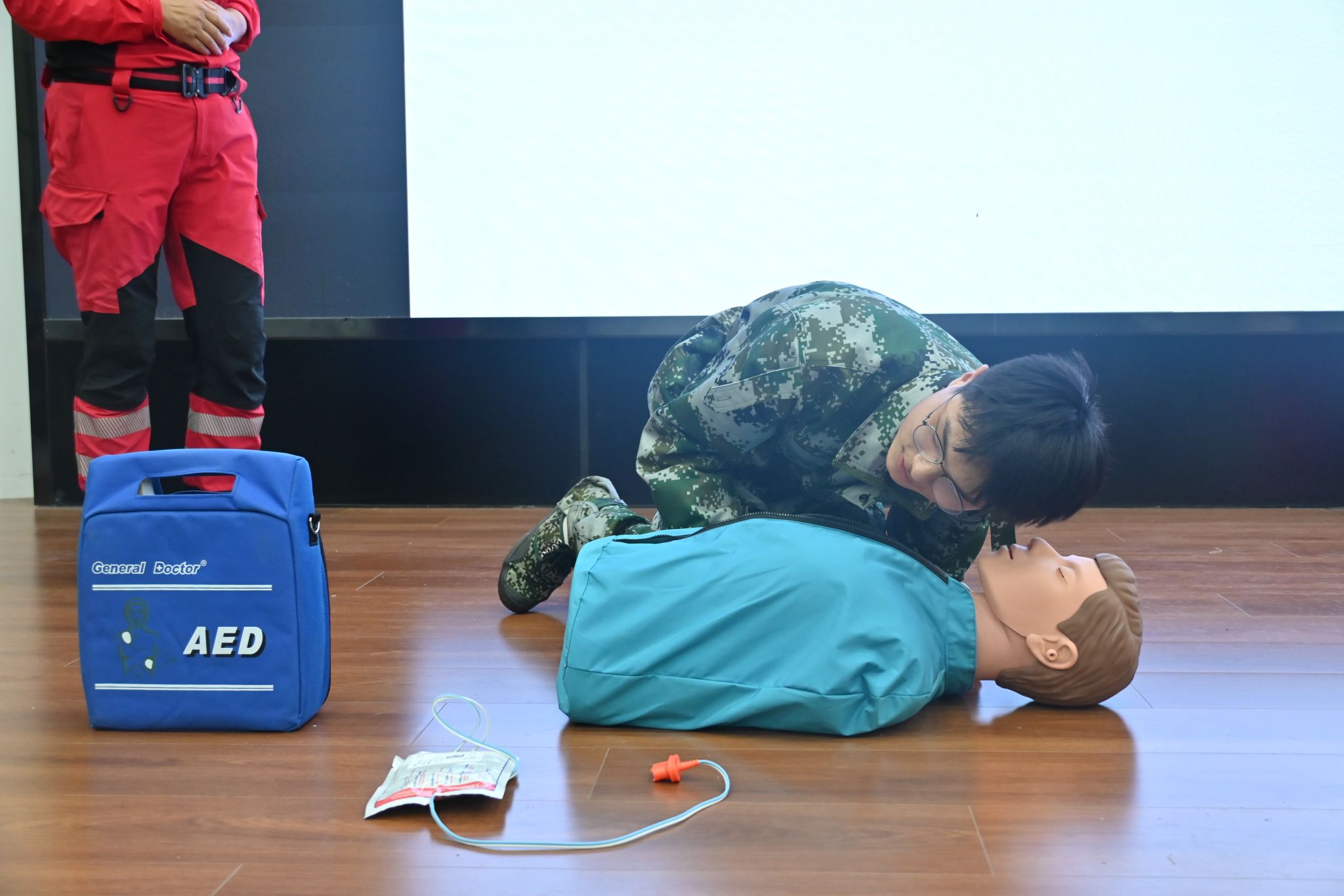 讲座中,王帅、赵娟系统讲解了应急救护技能:从人工呼吸的标准操作流程、自动体外除颤仪(AED)的使用规范,到心肺复苏(CPR)的动作要领,再到止血包扎的不同手法、异物梗阻处理等,将复杂的急救知识拆解为清晰易懂的步骤,确保新生能准确理解各类急救场景的应对措施。