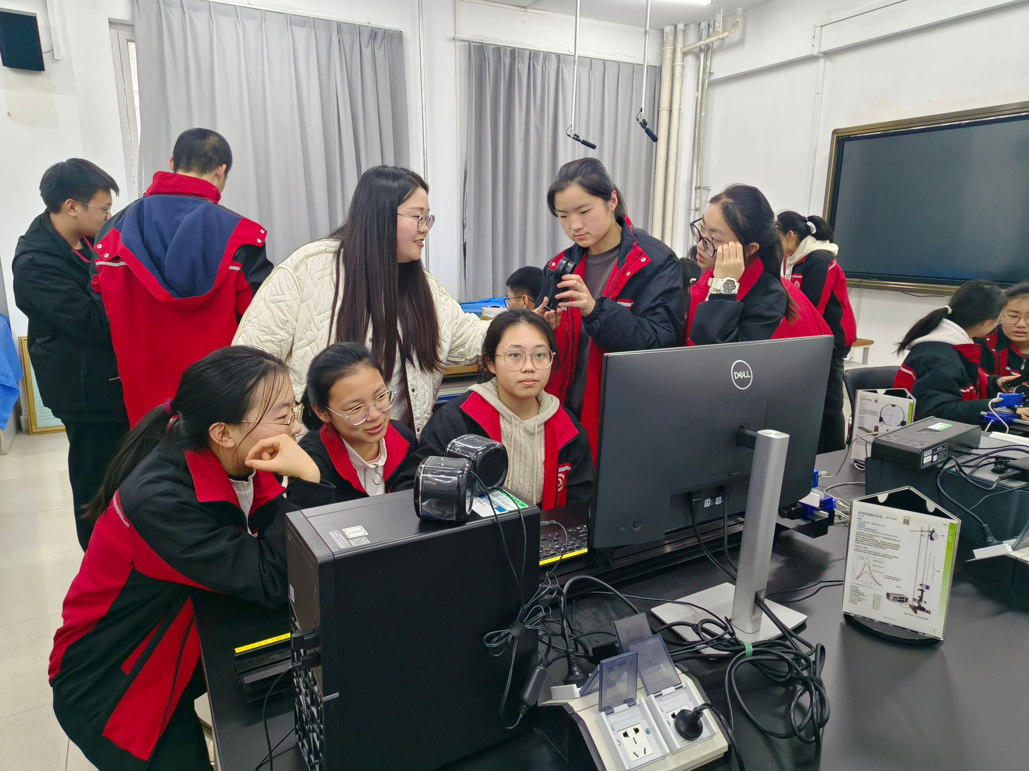 在教学展示中,研究生团队重点呈现了数字化实验的革命性优势。通过现代传感技术、实时数据采集与计算机分析系统,那些在传统实验中转瞬即逝或难以捕捉的物理现象——如复杂的运动轨迹、微妙的磁场分布、瞬变的光电信号等,都被转化为清晰直观、可精确量化的动态图像。附中学子不仅在观摩中感受到了物理学的魅力,更在研究生“小老师”的引导下亲手操作仪器,体验了从数据采集到分析的全过程。这种沉浸式学习不仅加深了对物理概念的理解,更在实践中培育了严谨求实的科学思维与探索精神。