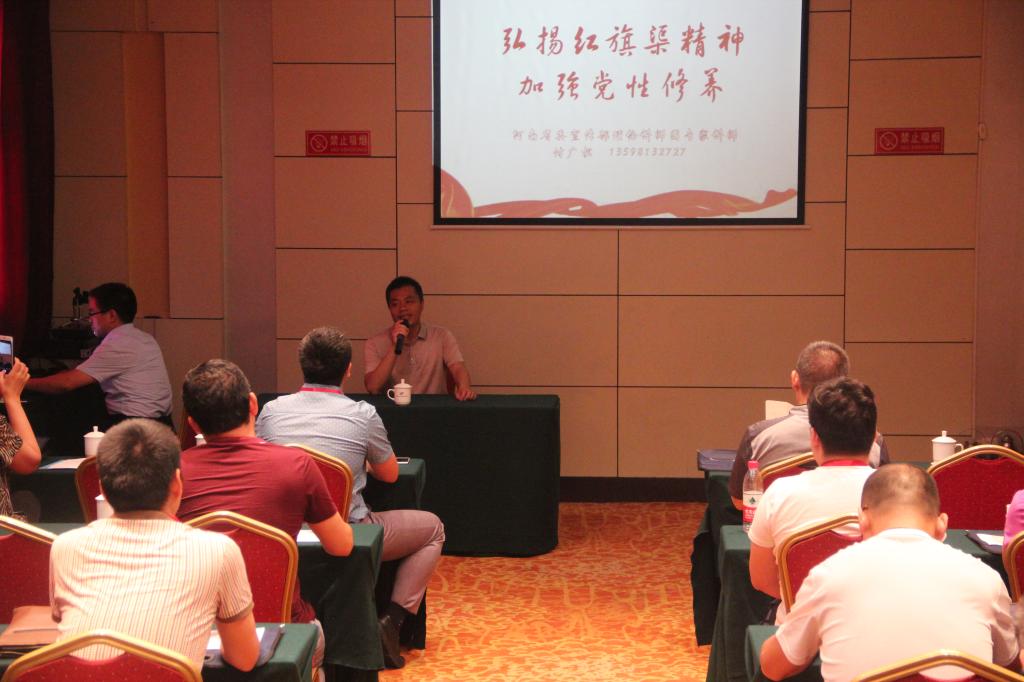 开班式结束后,河南省委宣传部理论讲师团专家讲师付广松,饱含深情地作了《弘扬红旗渠精神,加强党性修养》专题报告,详细介绍了上世纪六十年代,林县人民依靠自己勤劳和智慧的双手,历时十年,在太行山的悬崖峭壁上开凿出一条全长1500公里红旗渠的艰苦历程和感人事迹,深刻阐述了“自力更生、艰苦创业、团结协作、无私奉献”的红旗渠精神和“难而不惧、富而不惑、自强不已、奋斗不息” 当代红旗渠精神内涵。
