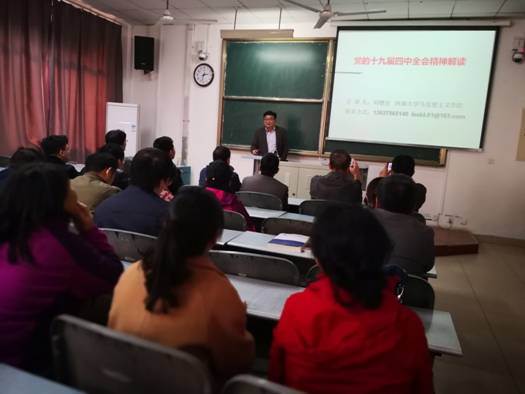 党委在金明综合楼5107教室举行“不忘初心、牢记使命”主题教育报告会,邀请马克思主义学院教授刘德定做了题为《党的十九届四中全会精神解读》的报告。报告由学院党委书记王宏华主持,学院全体教工聆听了报告。