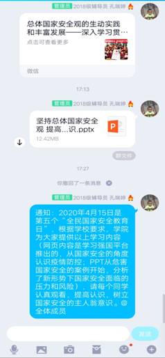 在学院网站、电子显示屏、微信公众号上推送“国家安全教育”相关知识;在教师微信群宣传河南省教育厅微信公众号上推出的典型案件;在学生QQ群上传《坚持总体国家安全观 提高国家安全意识》PPT,PPT从危害国家安全的案例开始,分析了新形势下国家安全面临的压力和风险,要求学生提高认识,树立国家安全的主人翁意识。