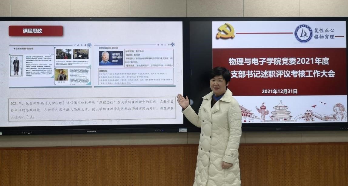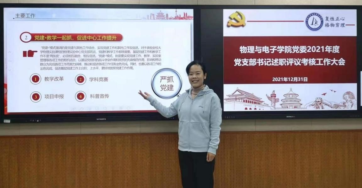 会上,各党支部书记分别从贯彻落实上级党组织工作部署、支部自身建设、“三会一课”制度落实、组织生活会和党支部特色工作、党建工作存在问题及下一步工作思考等方面进行了述职。各党支部围绕“党建+”,将党建工作与支部的特点工作相结合,亮点纷呈。其中,物理系教工第一党支部以“党建+科研”着力点,通过格物青年论坛的方式促进支部党员进行科研交流;大学物理教工党支部以“党建+课程思政”为出发点,创新课程形式,加强“课程思政”在《大学物理》教学中的实践,使大学物理与思想政治教育同行,彰显课程立德树人价值;电工电子实验中心教工党支部以“党建+宣传”为突破口,结合电工电子实验中心的教学优势,开辟新的宣传窗口,从“小物件”中引出“大思想”,推动党史教育深入学生;物理实验中心党支部书记以“党建+教学、党建+竞赛、党建+项目、党建+科普”为抓手,在教学中融入思政元素,在教学目标中体现思政功能,影响和带动广大教师努力拼搏,开创党建新局面。