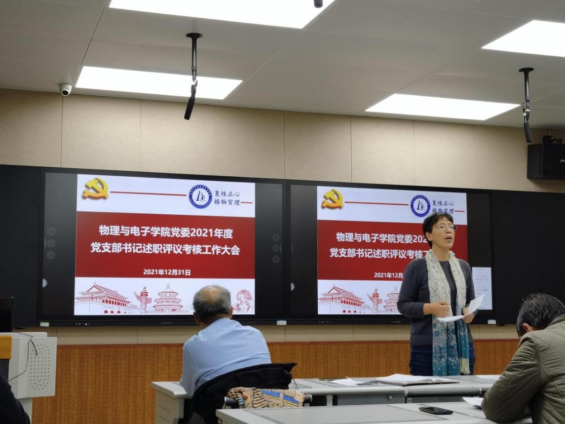 王宏华依次点评并总结,同时就新的一年党建工作作出部署和要求。她说,2021年各党支部书记能够切实履行党建主体责任、扎实推进开展党史学习教育,确保“规定动作不走样、自选动作有创新”,在严肃党内政治生活、提升学习活动实效性和感染力、拓宽联系服务师生群众等方面呈现出了特色和亮点。2022年将迎来党的二十大和学校110周年校庆,面对学校新一轮“双一流”建设发展机遇,各党支部要充分发挥战斗堡垒作用和党员的先锋模范带头作用,以党建引领师德师风建设与学风建设,以党建高质量推动学院高质量发展。