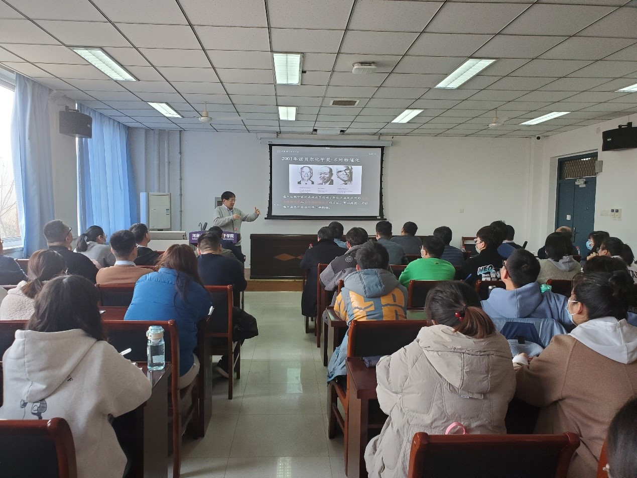 张振宇教授首先解读了科学家Syukuro Manabe、Klaus Hasselmann和Giorgio Parisi在复杂物理系统的理论建模及阐释方面作出的开创性贡献而获得2021年诺贝尔物理学奖背后的故事,介绍了物理学中复杂系统的研究脉络及其重大科学意义,结合自身和国内外学者的工作讲述了KPZ方程及界面生长等基础物理问题。随后,张振宇教授分享了对2021年诺贝尔化学奖关于不对称催化的物理理解,从物理学的角度阐述了化学催化过程中电子得失的本质。最后,张振宇教授梳理了国内外学者在相关领域的开拓性工作,对与会青年学者和研究生提出了深入研究科学问题、坚持坐冷板凳的期待。报告会后,张振宇教授与参会师生就感兴趣的问题进行了深入交流,探讨了如何从物理学的角度把握和理解其他跨学科所出现的新问题,分享了从事科学研究的研究心得和方法。现场气氛轻松活跃,报告会在热烈的掌声中圆满结束。
