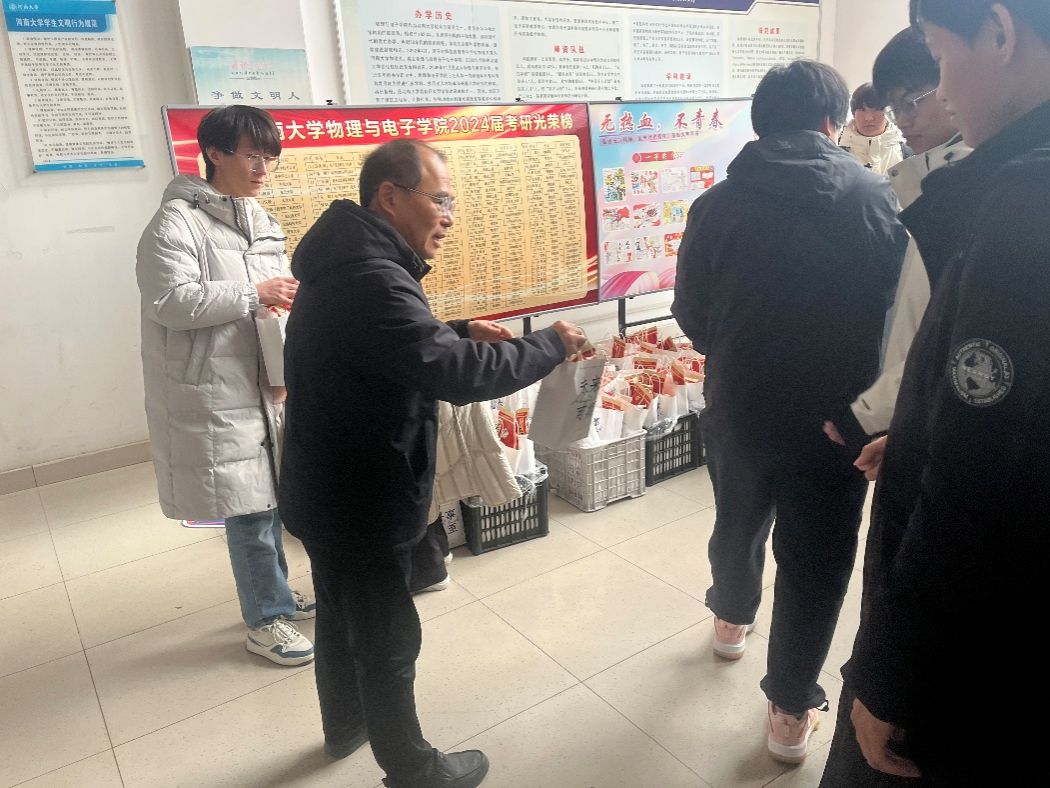 刘寒冰、张婷代表学院为考研学子发放 “考研暖心包”,饱含了学院对考研学子们浓浓的关爱和殷切的期盼,希望考研学子金榜题名,一“研”为定、成功上岸!收到礼包和祝福的同学们也纷纷表示一定不会辜负学院领导老师们的辛勤培养与真诚付出,奋力拼搏、勇往直前争取在考试中取得优秀成绩。