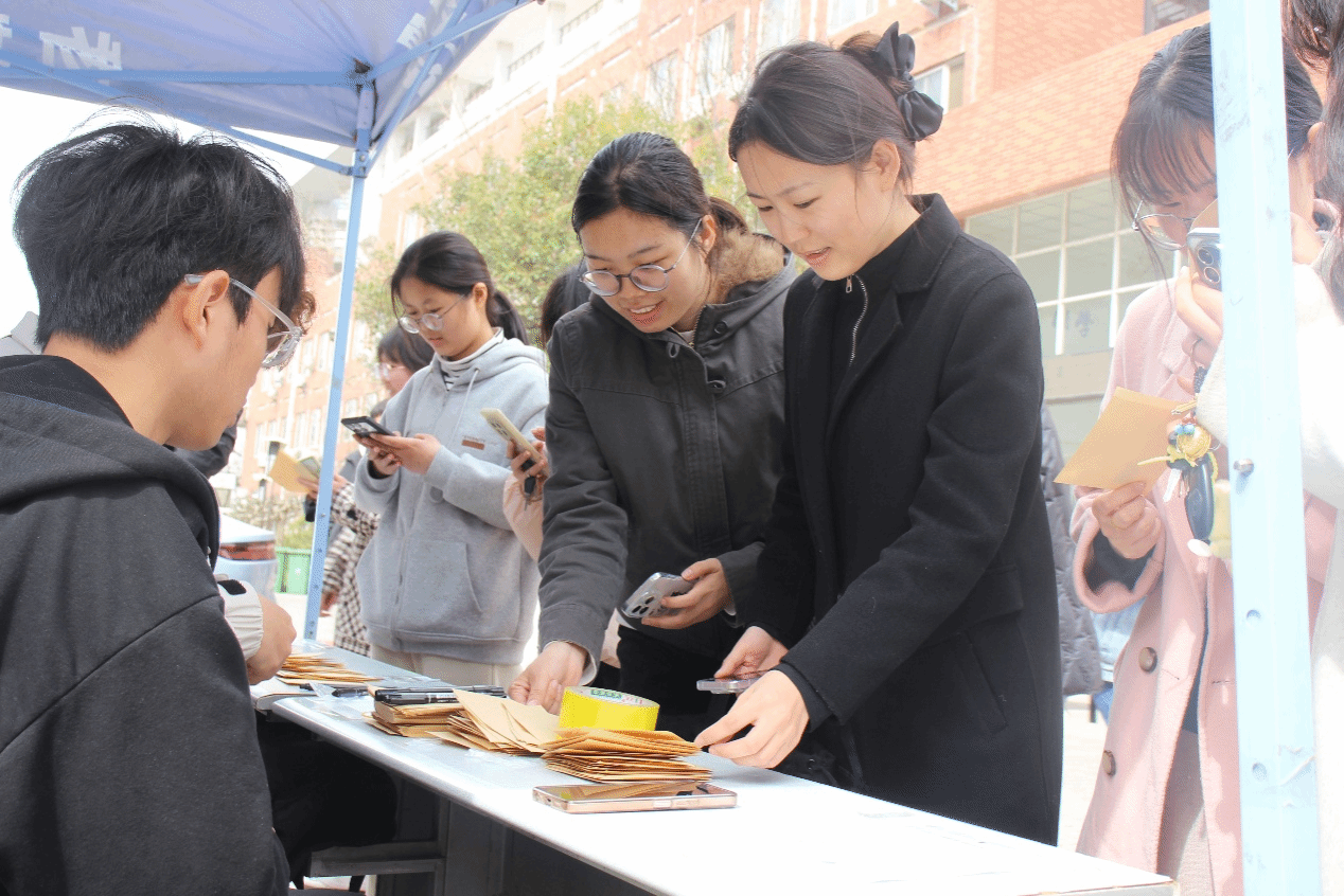 青年志愿者协会在学院A座楼下开展了赠送种子盲盒活动。师生们踊跃参与,扫码、抽种、领盆,流程顺畅有序。活动现场气氛热烈,盲盒迅速分发完毕。这份“绿色惊喜”不仅让大家感受到播种希望的乐趣,也激发了大家对环保的关注与热情。